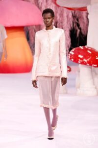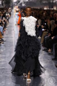 Com Matthieu Blazy à frente, a coleção Chanel foi um dos destaques mais discutidos da alta-costura. A passarela se tornou um verdadeiro cenário fantasioso, com tecidos fluídos e detalhes em penas que criaram um efeito de movimento e luz quase como pássaros em voo. A grife revisitou suas peças icônicas (como o clássico tailleur) com transparências, texturas suaves e uma poesia tátil de materiais.