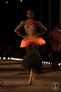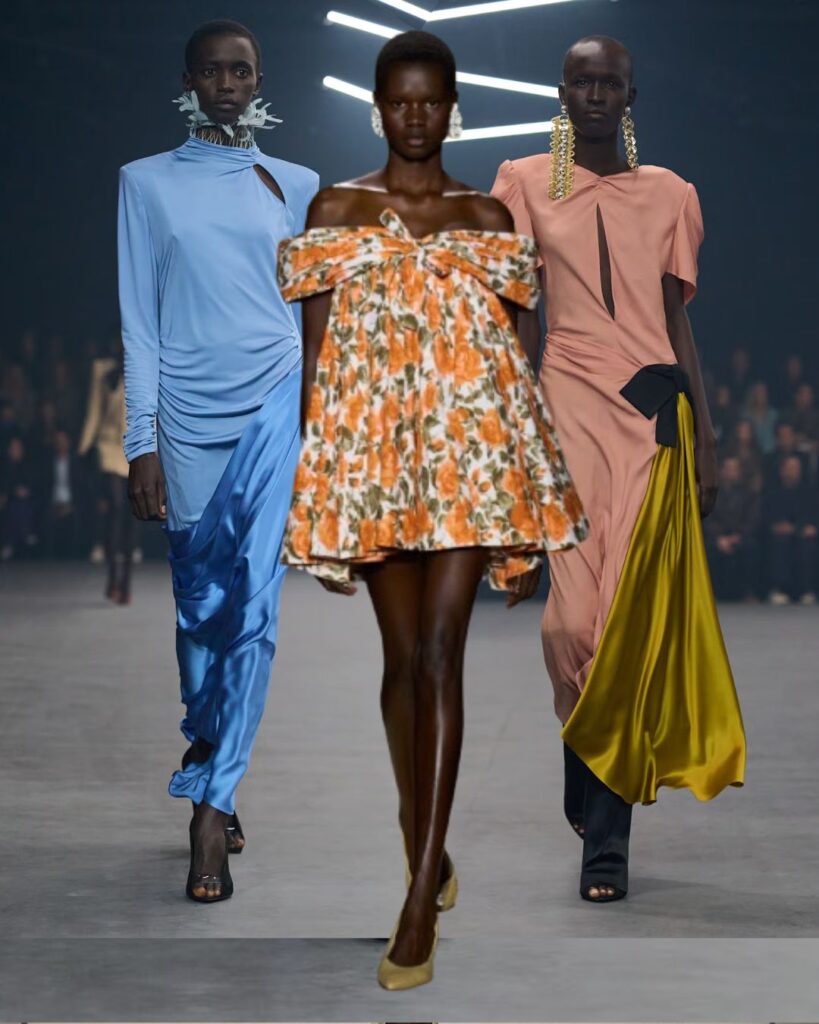 O desfile de Daniel Roseberry para Schiaparelli trouxe peças que desafiam a lógica tradicional da moda. Garras, formas inspiradas em animais, plumas ultra-estruturadas e esculturas têxteis transformaram vestidos em esculturas performáticas como verdadeiras obras de arte vestíveis.